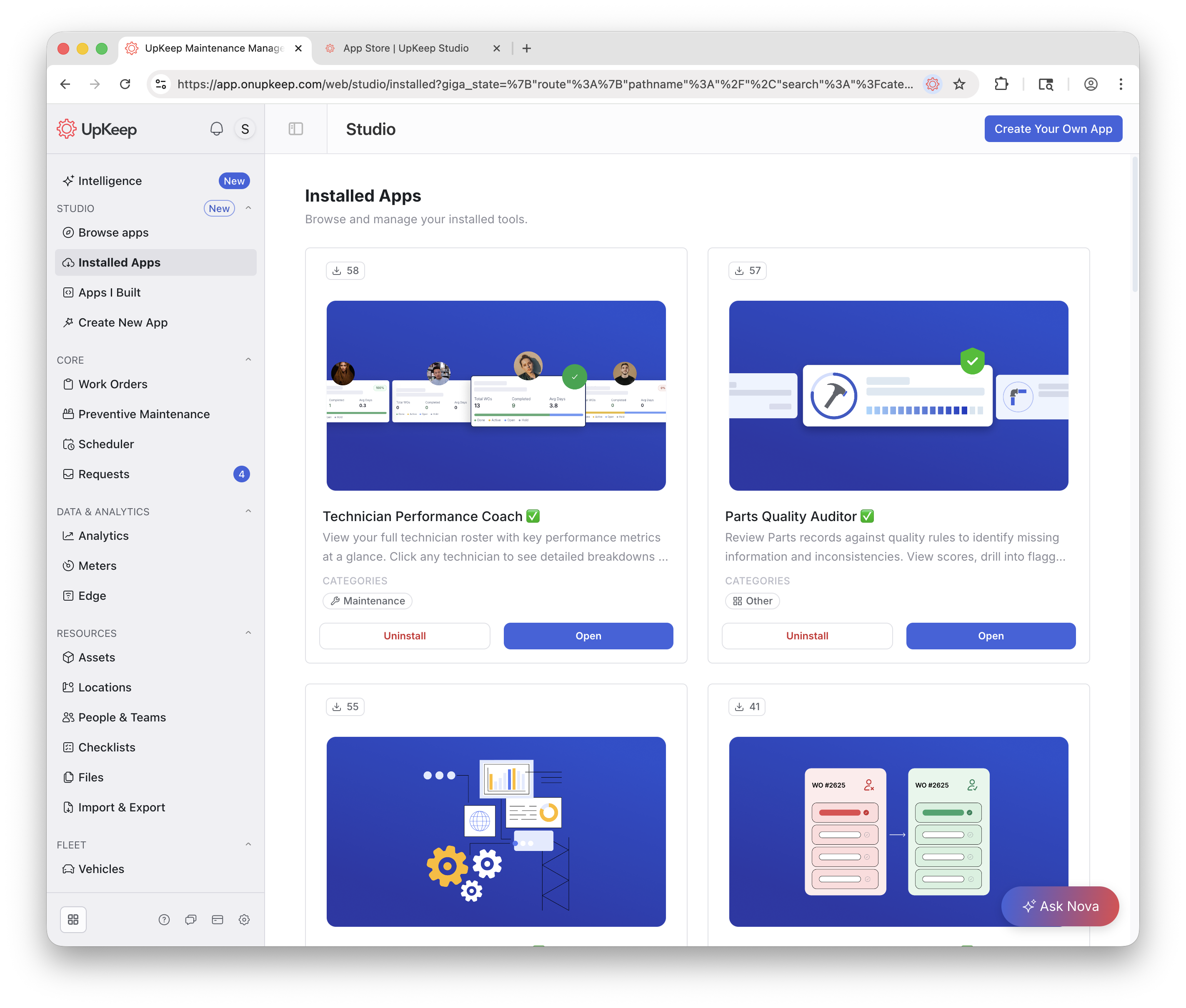 UpKeep Studio is available now. The App Marketplace is included on Premium plans and above. The AI App Builder is available on Professional plans and above.