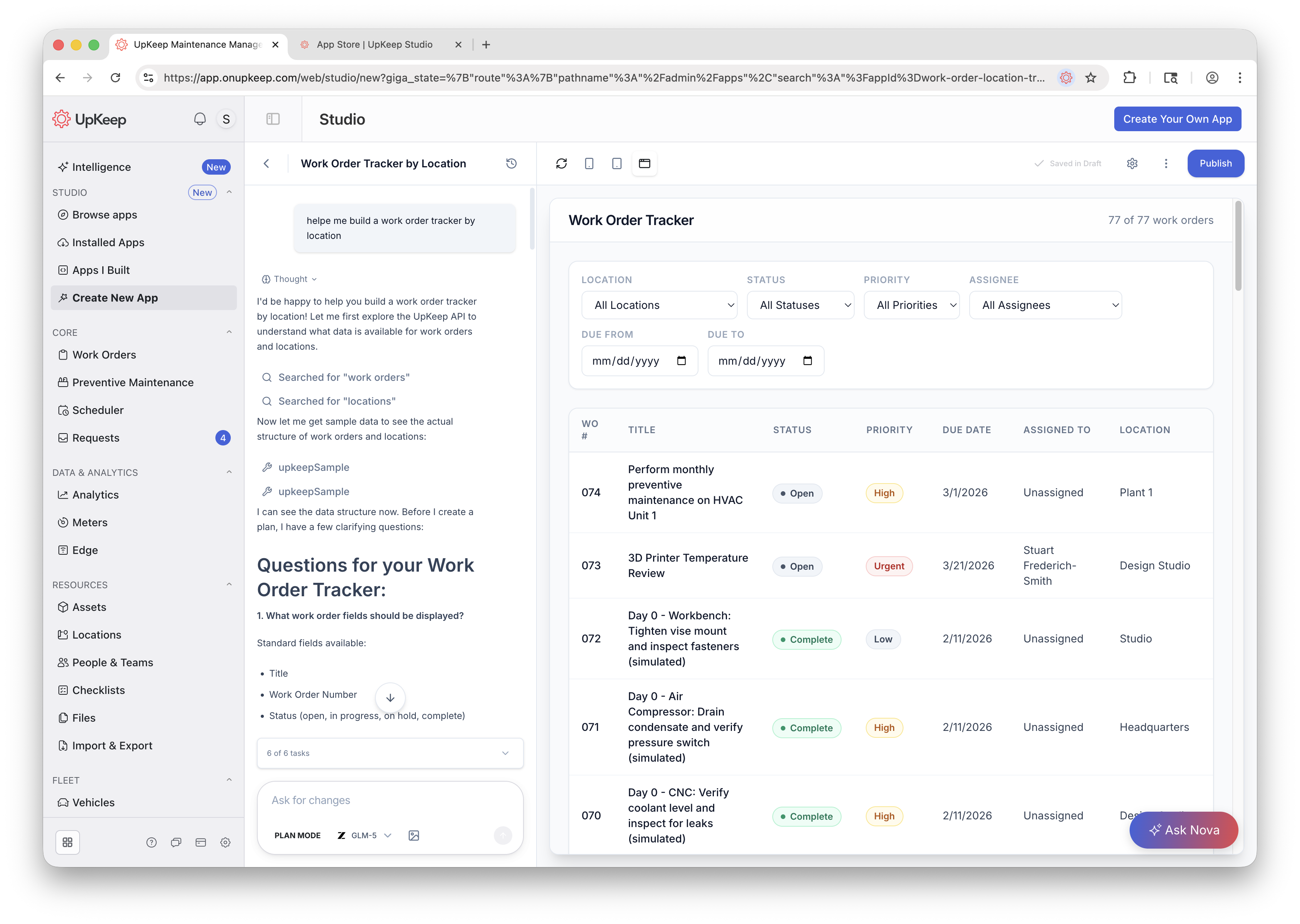 - AI App Builder: A chat-based interface where users describe the app they need in plain language and Studio builds it. The builder has full read/write access to the UpKeep API, so apps work with real data.